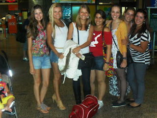 Ok, lembro que aquele dia chovia demais. Arrastar minhas duas malas tamanho familia, mais a de mao pra dentro de um onibus, nao foi facil. Eramos seis pessoas a caminho da California. Uma brasileira (eu), uma colombiana, uma australiana, uma alema, uma venezuelana e um mexicano. Esperamos juntos pelo nosso voo pra San Francisco, e foi muito legal! Foto no detalhe (falta a australiana).